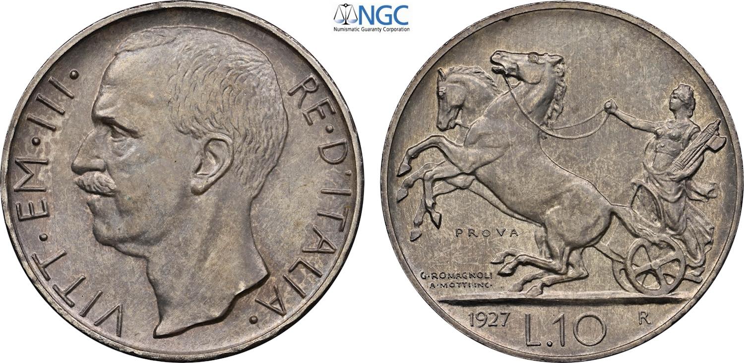Regno d'Italia, Vittorio Emanuele III (1900-1943), 10 Lire 1927 Prova, RRRR Pag-211 Ag 27 mm, 10 g, in Slab NGC MS64 (only 1 coin is graded ...