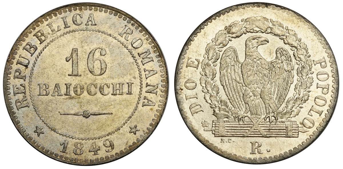 Roma, Seconda Repubblica Romana, 16 Baiocchi 1849, Mi mm 26, ottimo esemplare, q.FDC
