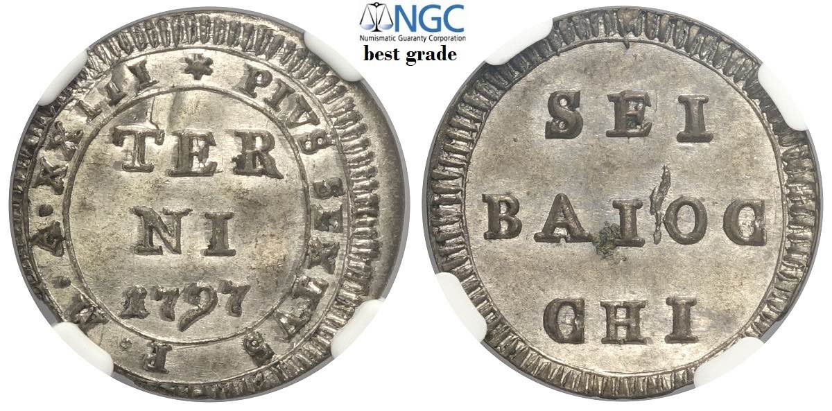Terni, Pio VI, Muraiola da 6 Baiocchi 1797 anno XXIII, Mi mm 23 conservazione inusuale, in slab NGC MS63 (miglior esemplare sigillato NGC)