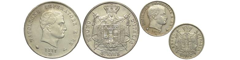 Milano (1805-1814) – Lotto di 2 monete - Milano – Napoleone (1805-1814) – Lotto di 2 monete:5 Lire 1811 tracce di pulizia ;Lira 1812 ...