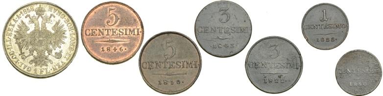 Venezia – Lotto di 7 Monete - Venezia – Lotto di 7 Monete:Fiorino 1858 - Rara BB-SPL ; 5 Lire 1811 Rara MB lavata ; Centesimo 1810 NC ...