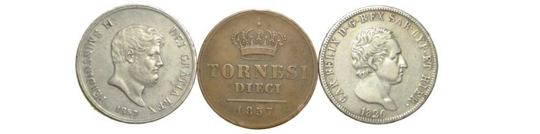 Napoli / Savoia – Lotto di 3 Monete - Napoli / Savoia – Lotto di 3 Monete:Piastra 1857 BB+ ; 10 Tornesi 1857 colpetto BB5 Lire 1826 ...