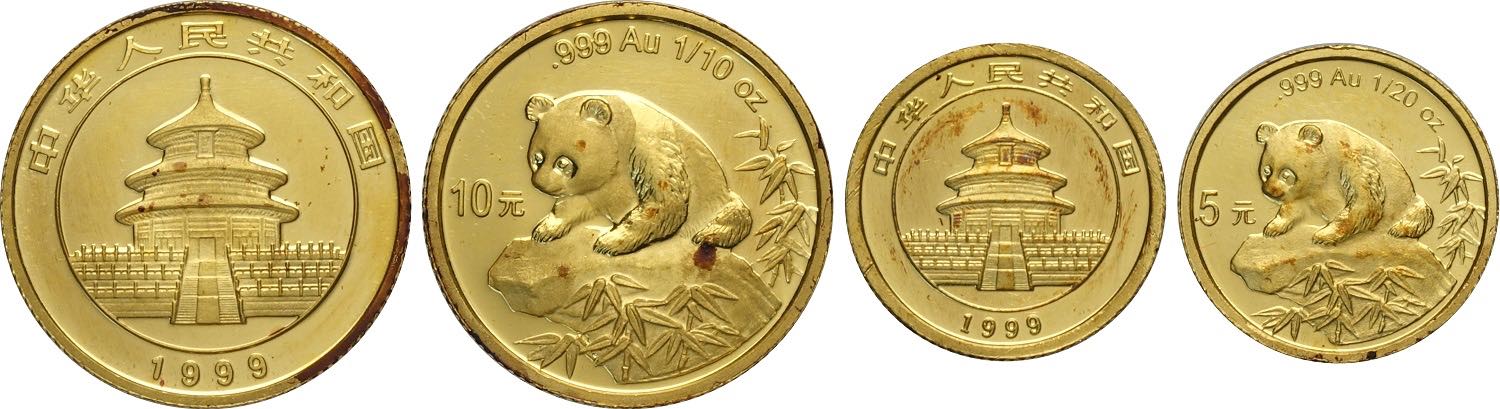 China, People's Republic (1949-), Lot of 2 Gold Panda series 1999: 10 Yuan (1/10 Oz), 5 Yuan (1/20 Oz), FDC/Proof
