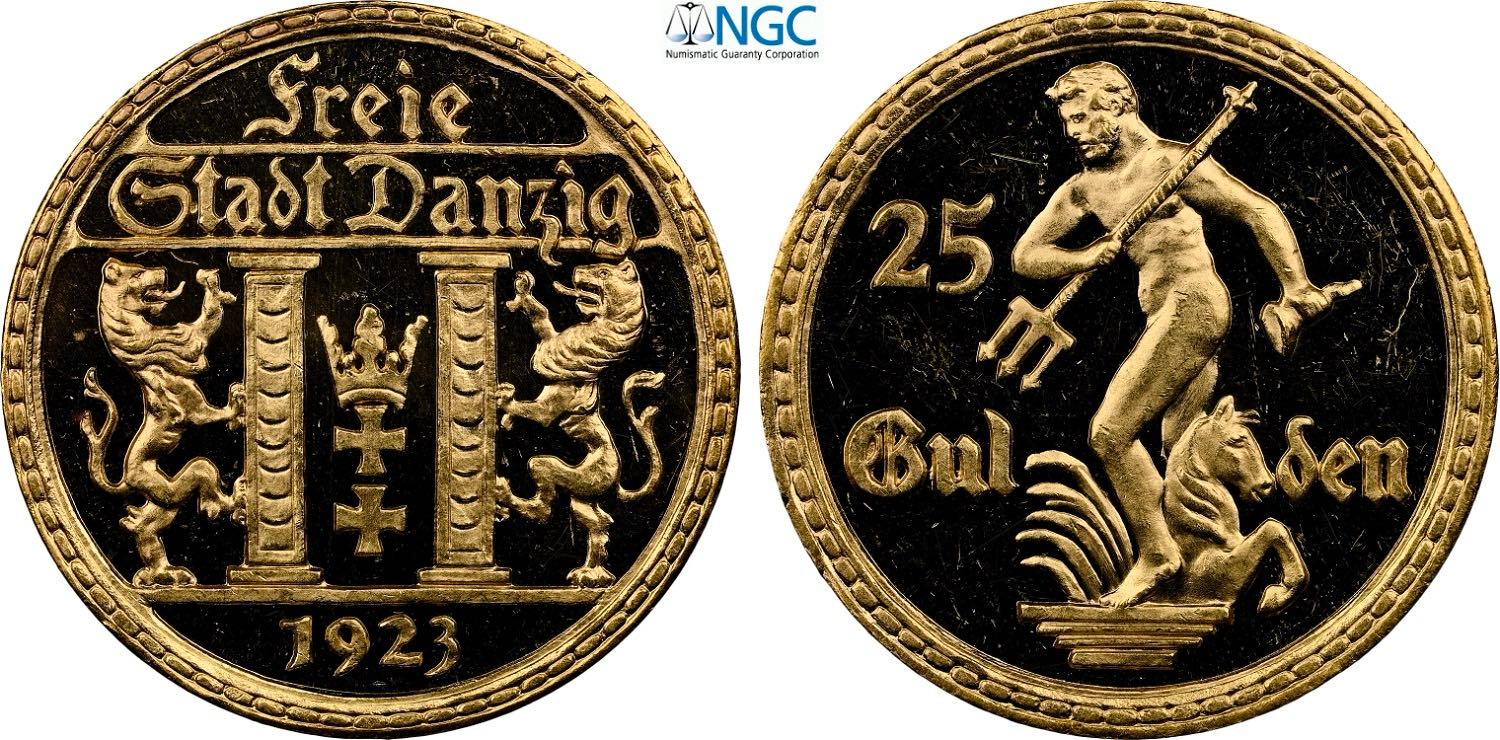 Danzig, Free City (1920-1939), 25 Gulden 1923, RR Au 22 mm 7,99 g, in Slab NGC PF63+ Ultra Cameo