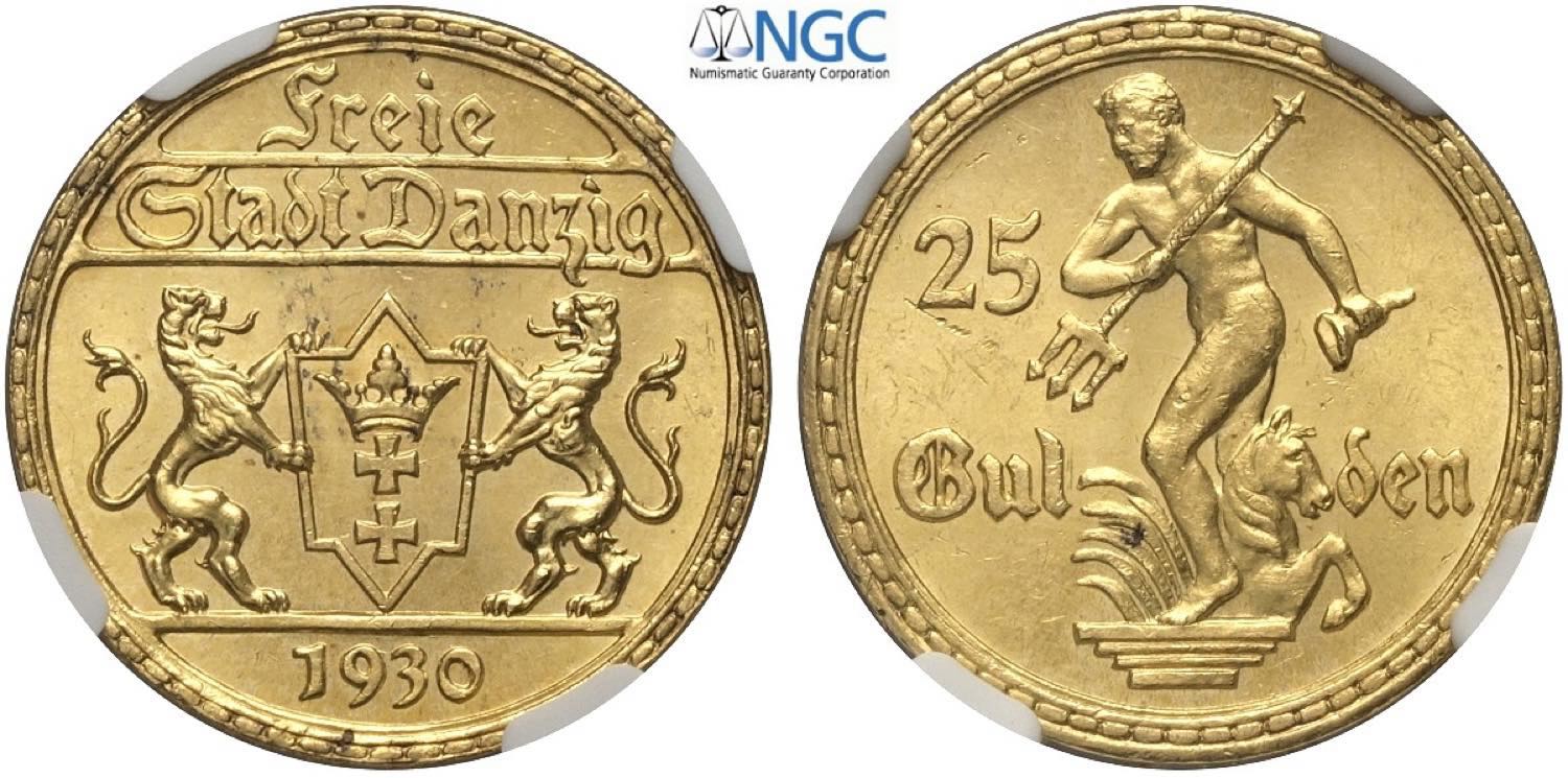 Danzig, Free City (1920-1939), 25 Gulden 1930, Rara Au 22 mm 7,99 g, in Slab NGC MS64