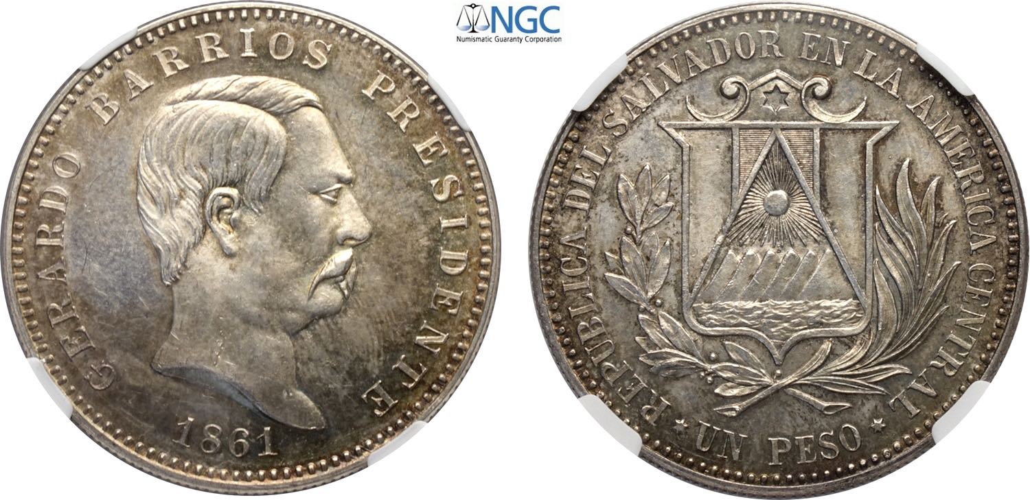 El Salvador, Republic (1841-), Silver Peso 1861 (restrike 1971), KM-X5c Ag 37 mm 25 g, in Slab NGC PF64