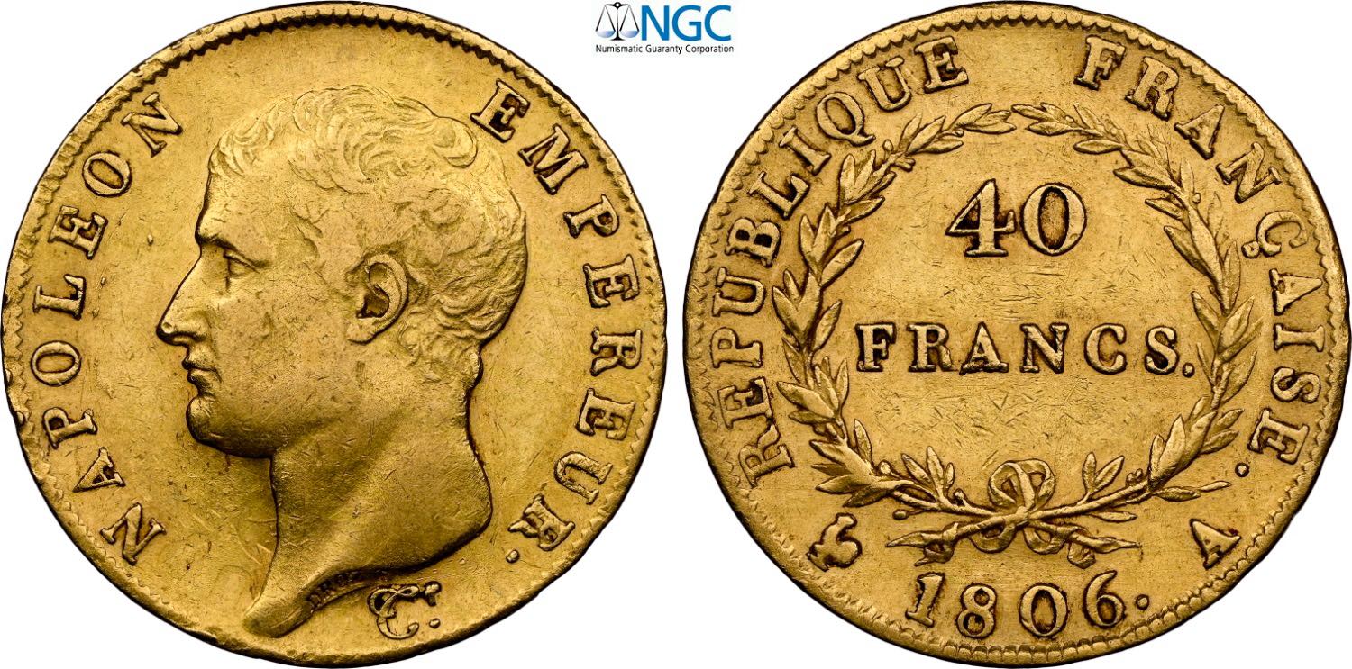 France, Napoleon I (1799-1814), 40 Francs 1806-A, Paris mint, Au 26 mm 12,90 g, in Slab NGC AU55