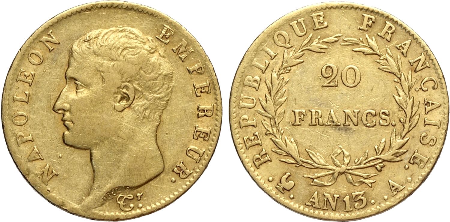 France, Napoleon I (1799-1814), 20 Francs AN 13-A, Paris mint, Au 21 mm 6,42 g, BB+