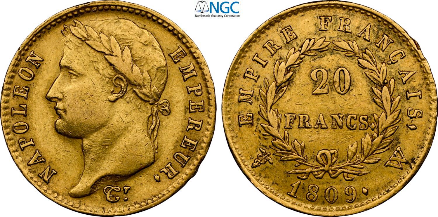 France, Napoleon I (1799-1814), 20 Francs 1809-W, Lille mint, Au 21 mm 6,45 g, in Slab NGC AU55 (cert. 6647437004 second best grade)