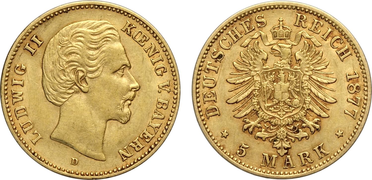 Germany Bavaria, Ludwig II (1864-1886), 5 Mark 1877-D, Munich mint, Au 17 mm, q.SPL