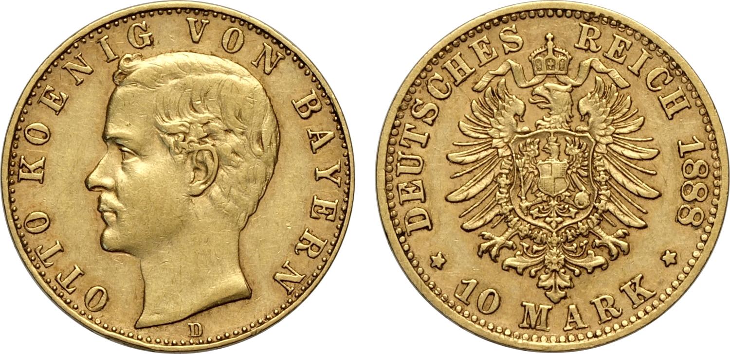 Germany Bavaria, Otto (1886-1913), 10 Mark 1888-D, Munich Mint, Au 19,5 mm, colpo al bordo BB