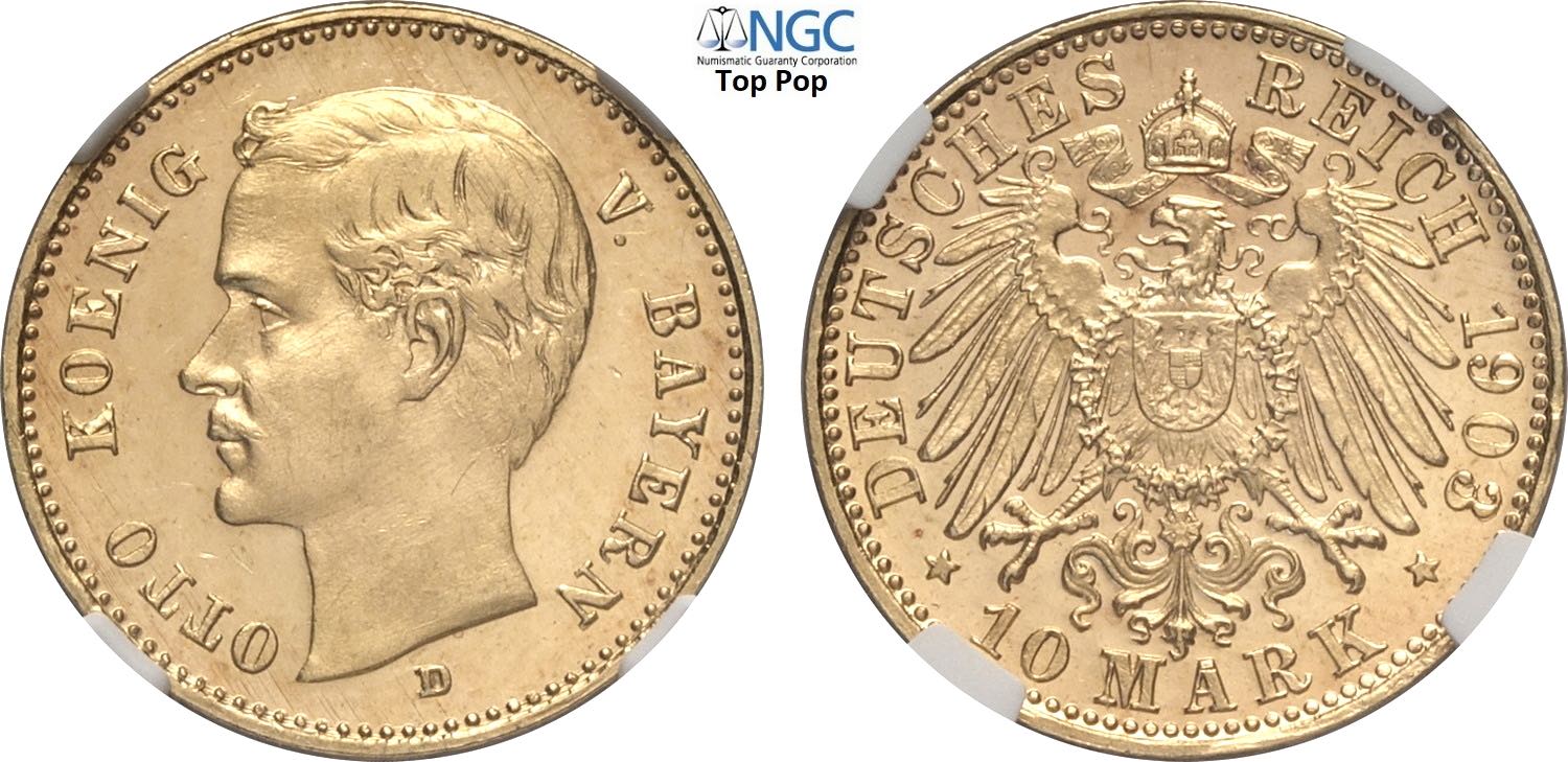 Germany Bavaria, Otto (1886-1913), 10 Mark 1903-D, Munich Mint, Au 19,5 mm 3,98 g, conservazione eccezionale, in Slab NGC PF65+ Ultra Cameo ...