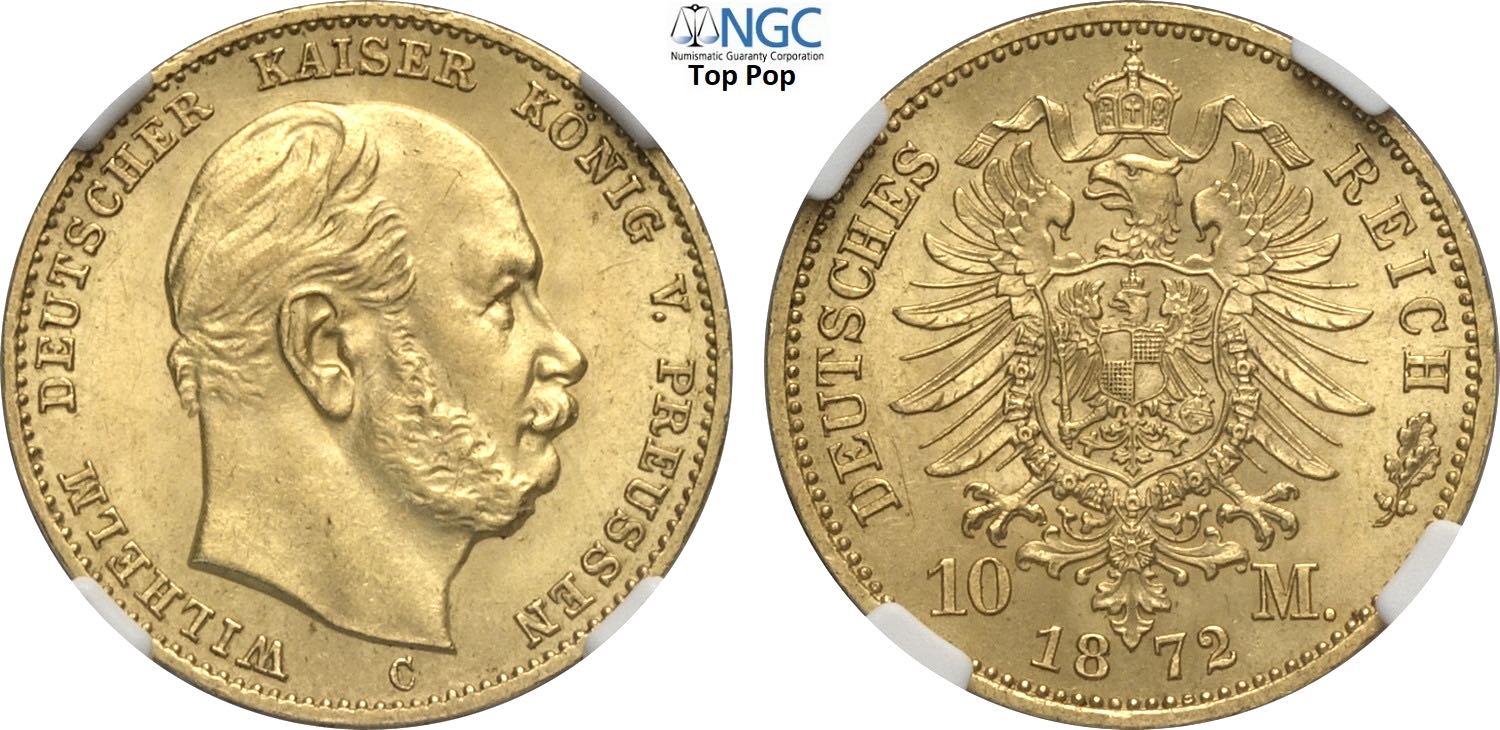 Germany Prussia, Wilhelm I (1861-1888), 10 Mark 1872-C, Frankfurt am Main Mint, Au 19,5 mm 3,98 g, di gran qualità per il millesimo, in ...