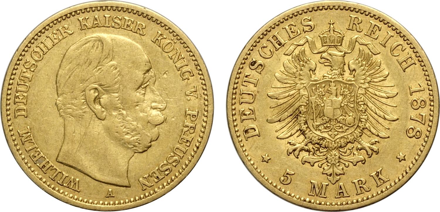 Germany Prussia, Wilhelm I (1861-1888), 5 Mark 1878-A, Berlin Mint, Au 17 mm, BB