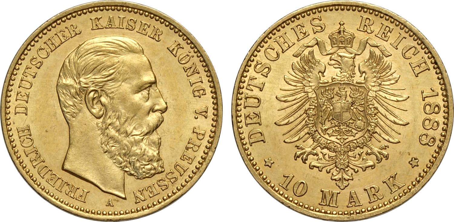 Germany Prussia, Friedrich III (1888), 10 Mark 1888-A, Berlin mint, Au 20 mm 3,98 g, SPL