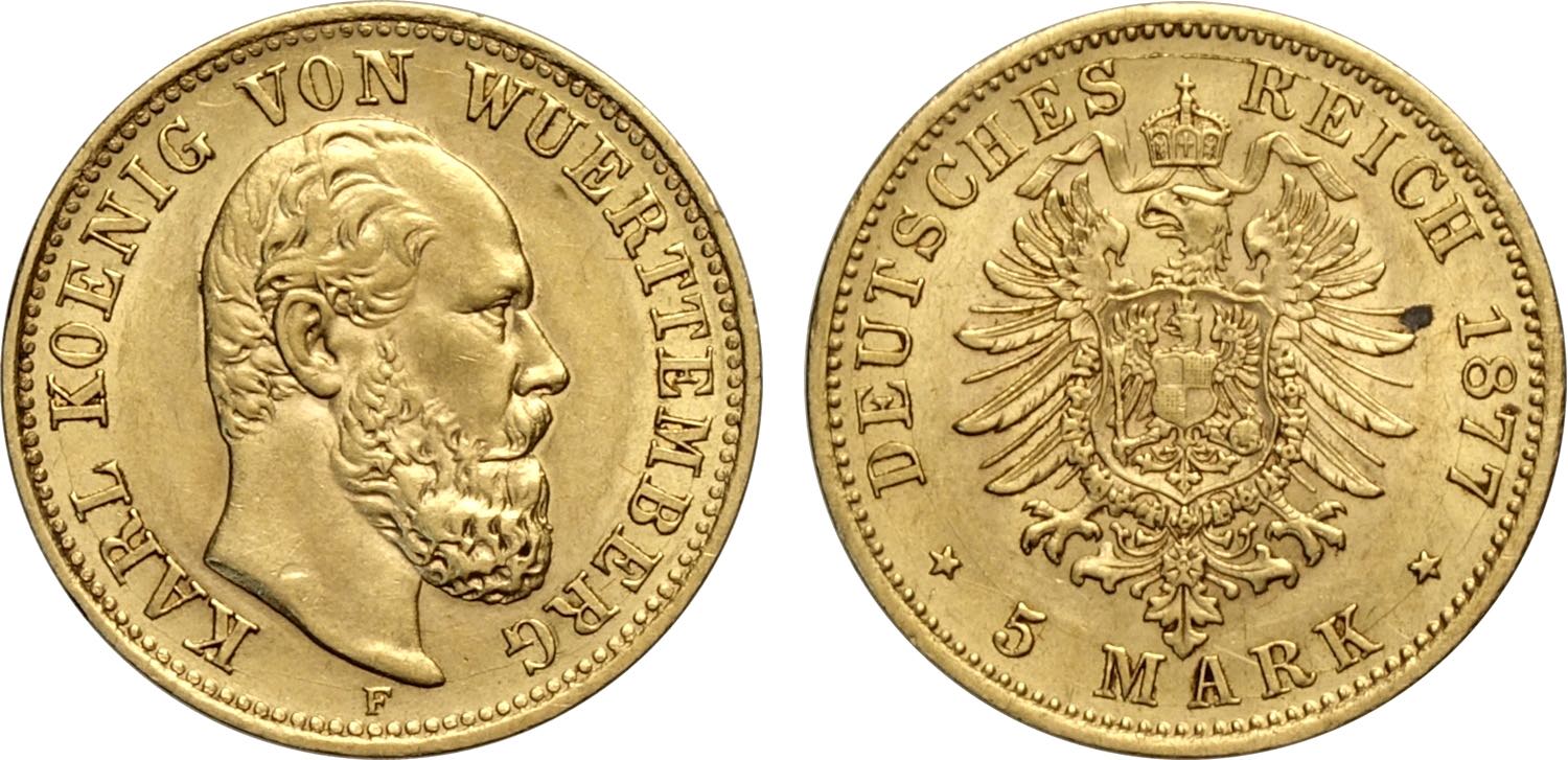 Germany Wurttemberg, Karl I (1864-1891), 5 Mark 1877-F, Stuttgard mint, Au 17 mm, SPL-FDC