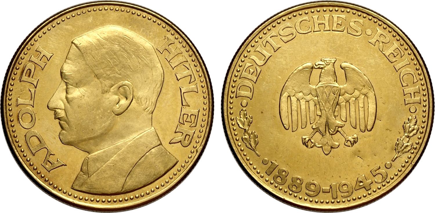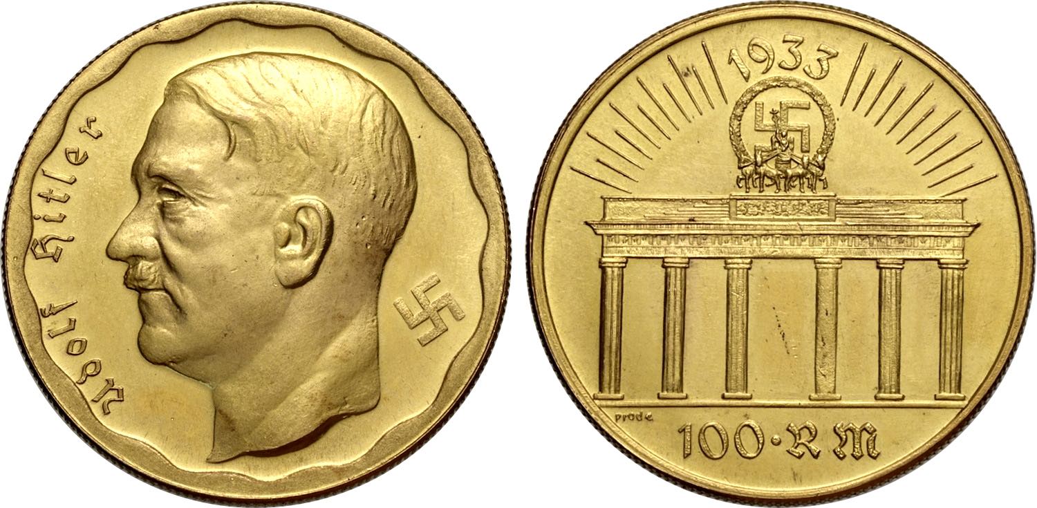 Germany, Fantasy Gold 100 Reichsmark 1933 Adolf Hitler (presumably minted in the 70s), Colbert-403, Au 36 mm 29,81 g, FDC/Prooflike
