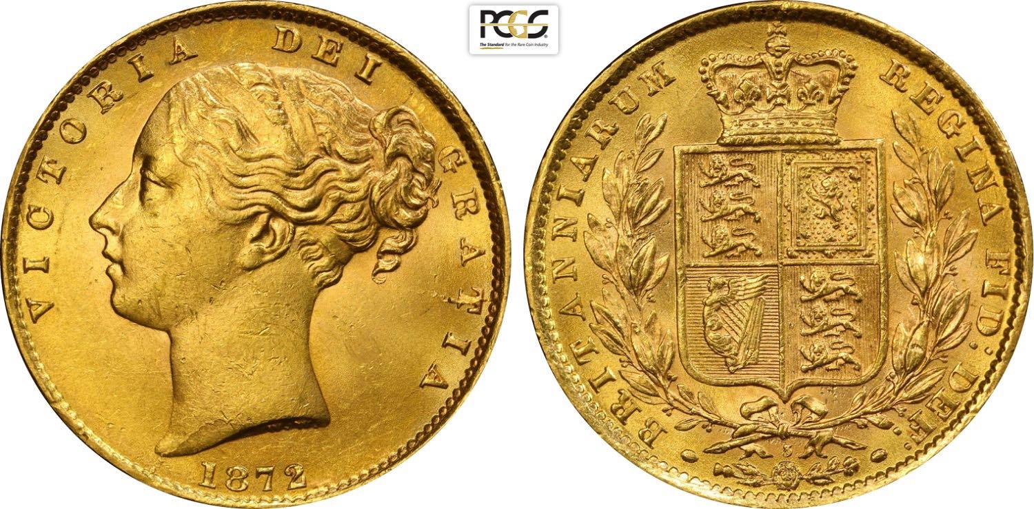 Great Britain, Victoria (1837-1901), Shield Sovereign 1872, London Mint, Die number 3, S-3853B Au 22 mm 7,99 g, in Slab PCGS MS63