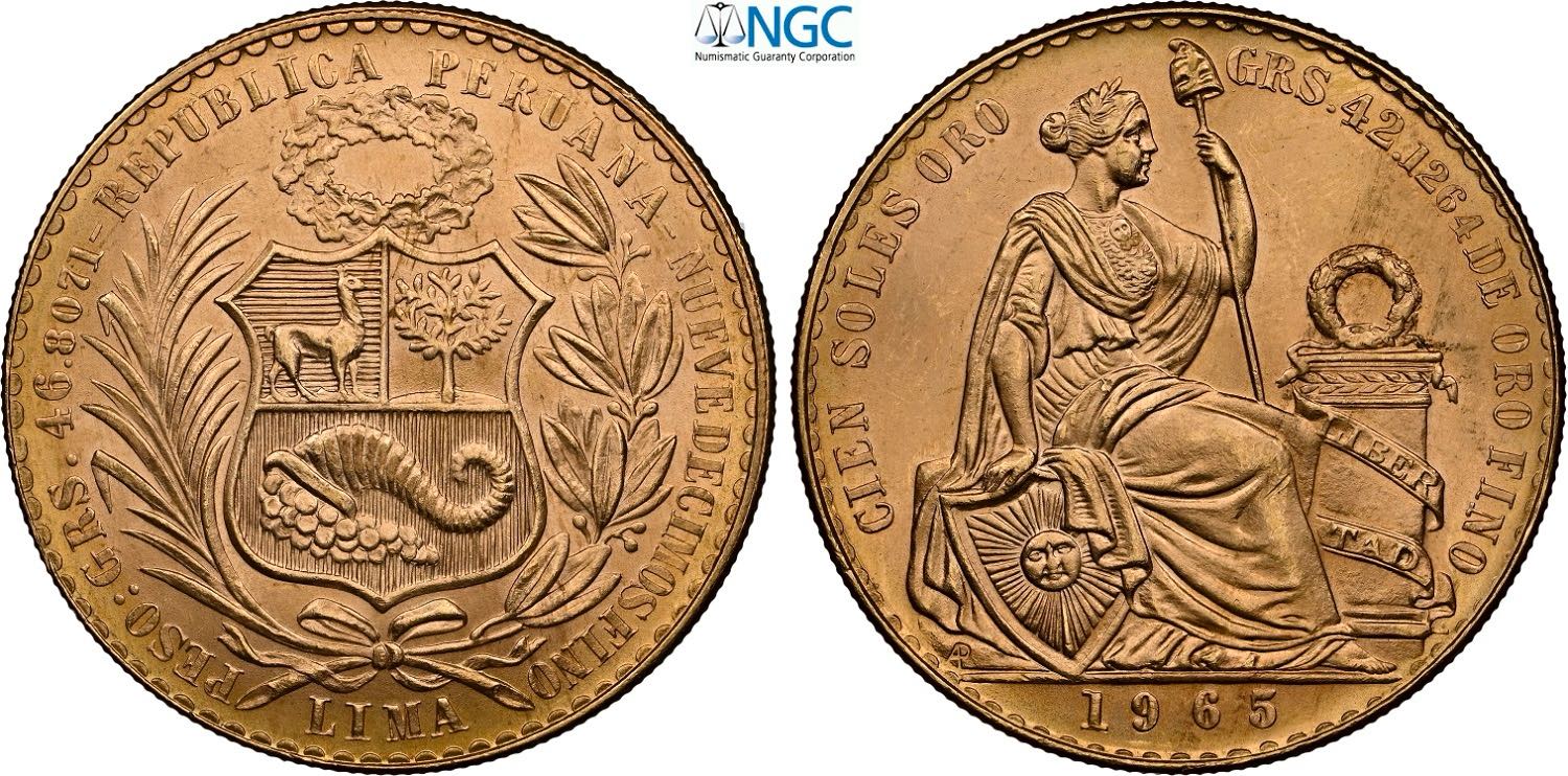 Perù, Republic (1882-), 100 Soles 1965, Lima mint, Au 37 mm 46,80 g, alta conservazione, in Slab NGC MS65