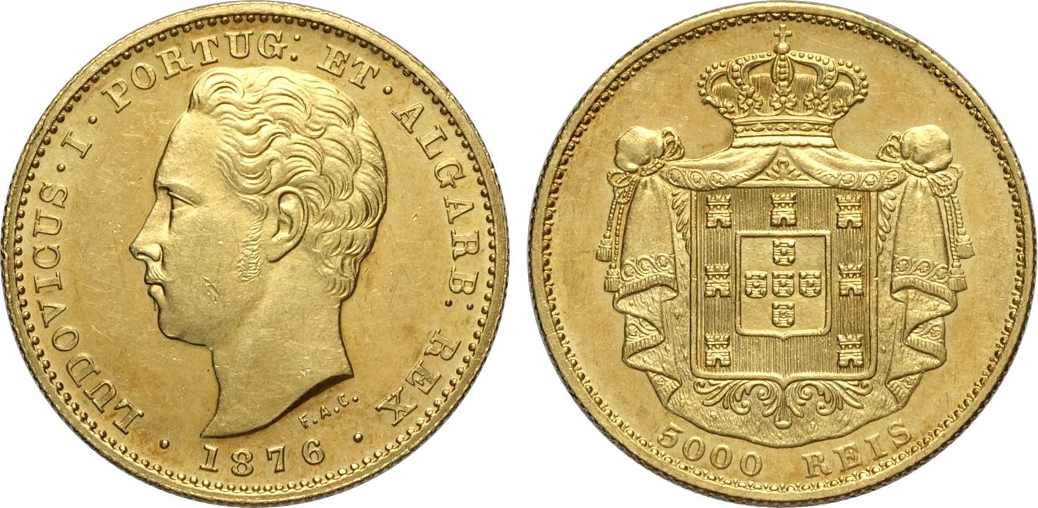Portugal, Luiz I (1861-1889), 5000 Reis 1876, Lisbon mint, mintage: 15000, Au 23 mm 8,86 g, SPL-FDC