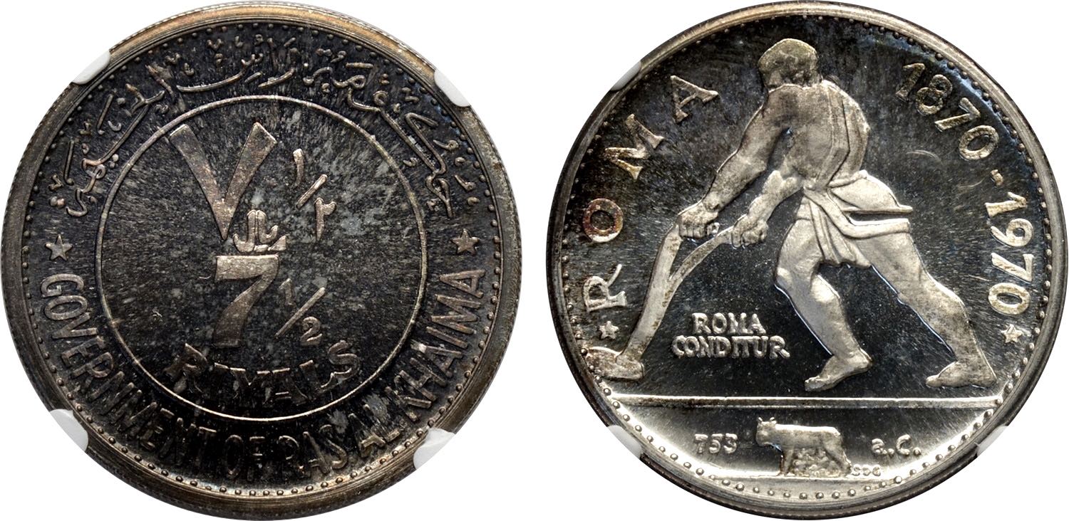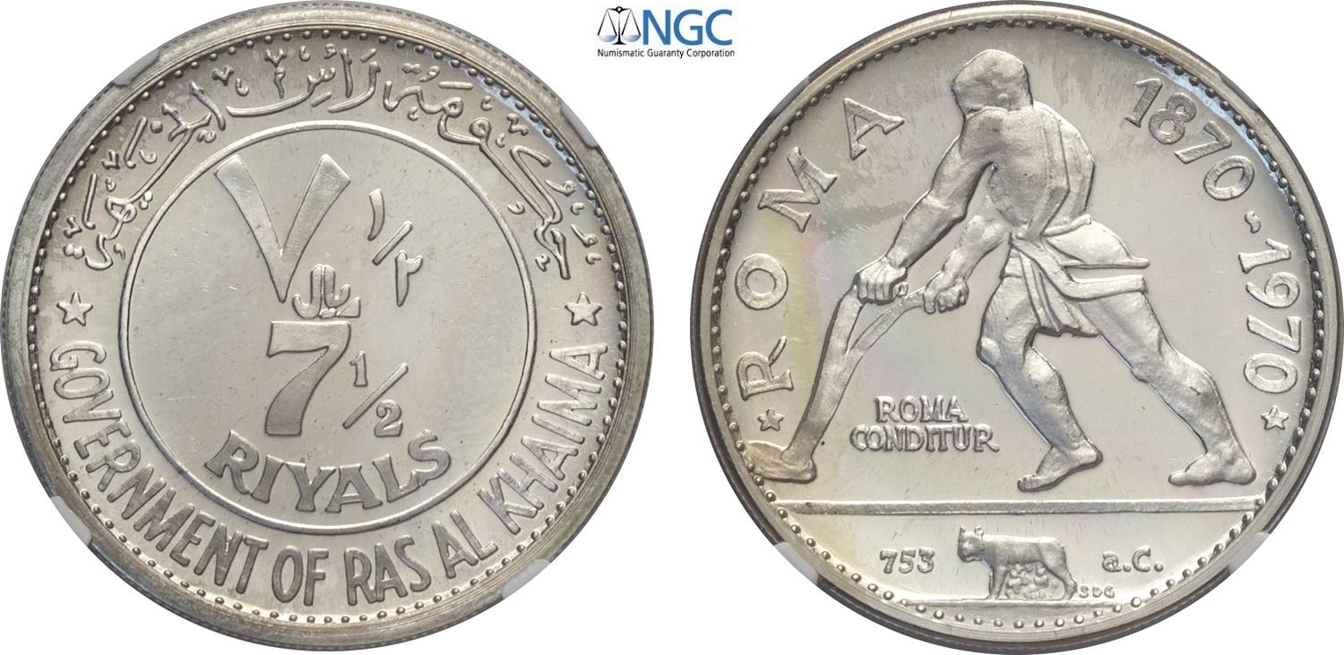 Ras Al-Khaimah, Saqr Bin Muhammad al-Qasimi (1948-), 7,5 Riyals 1970, KM-17 Ag 34 mm 22,5 g, in Slab NGC PF66 Ultra Cameo