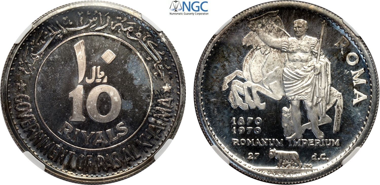 Ras Al-Khaimah, Saqr Bin Muhammad al-Qasimi (1948-), 10 Riyals 1970, KM-18 Ag 40 mm 30 g, in Slab NGC PF68 Ultra Cameo