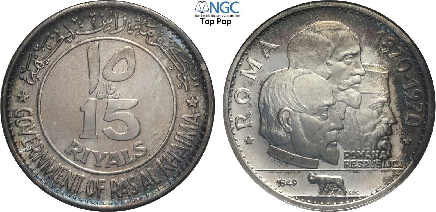 Ras Al-Khaimah, Saqr Bin Muhammad al-Qasimi (1948-), 15 Riyals 1970, KM-19 Ag 44 mm 45 g, in Slab NGC PF67 Cameo Top Pop! (cert. 6643224011)