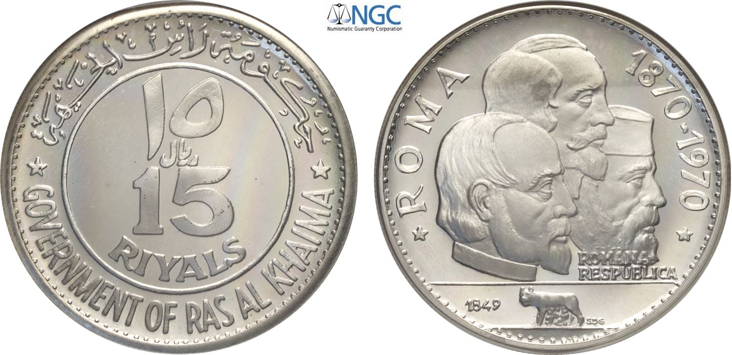 Ras Al-Khaimah, Saqr Bin Muhammad al-Qasimi (1948-), 15 Riyals 1970, KM-19 Ag 44 mm 45 g, in Slab NGC PF67 Ultra Cameo