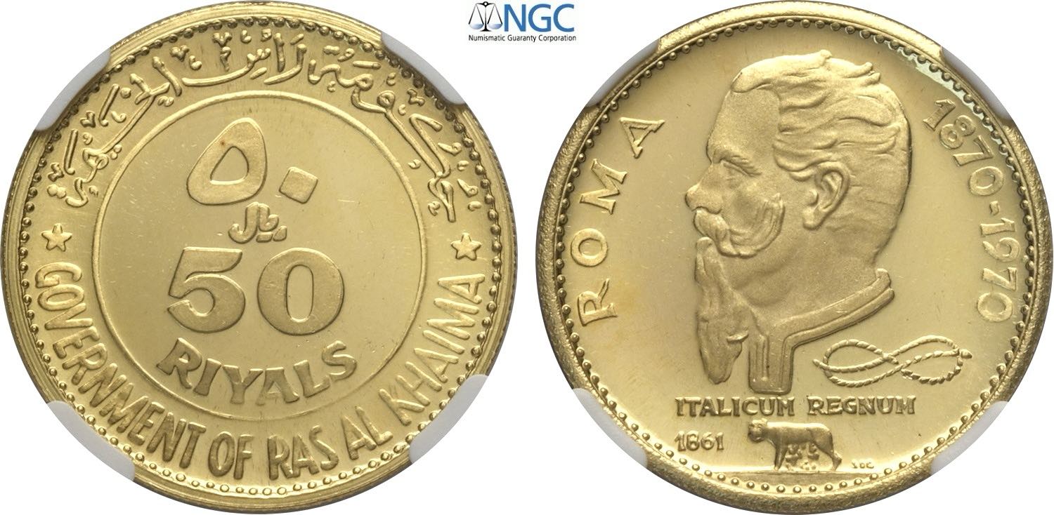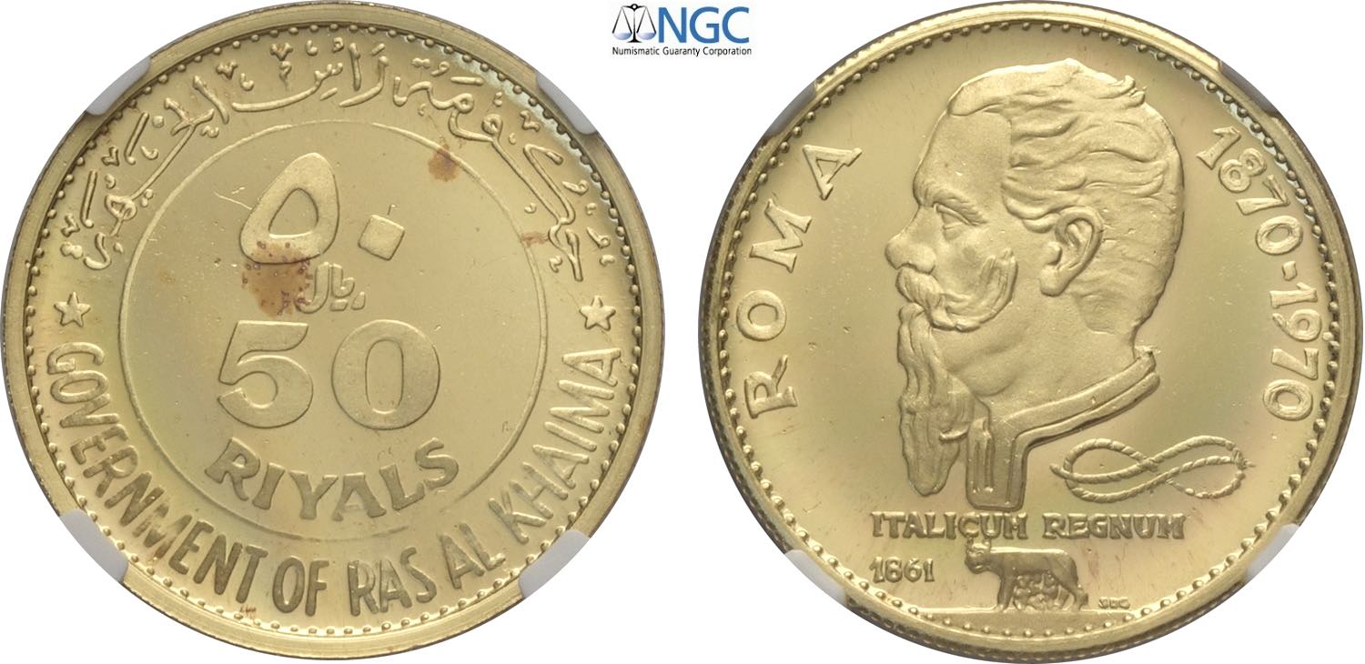Ras Al-Khaimah, Saqr Bin Muhammad al-Qasimi (1948-), 50 Riyals 1970, KM-21 Au 25 mm 10,35 g, in Slab NGC PF67 Ultra Cameo