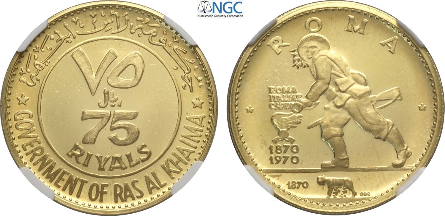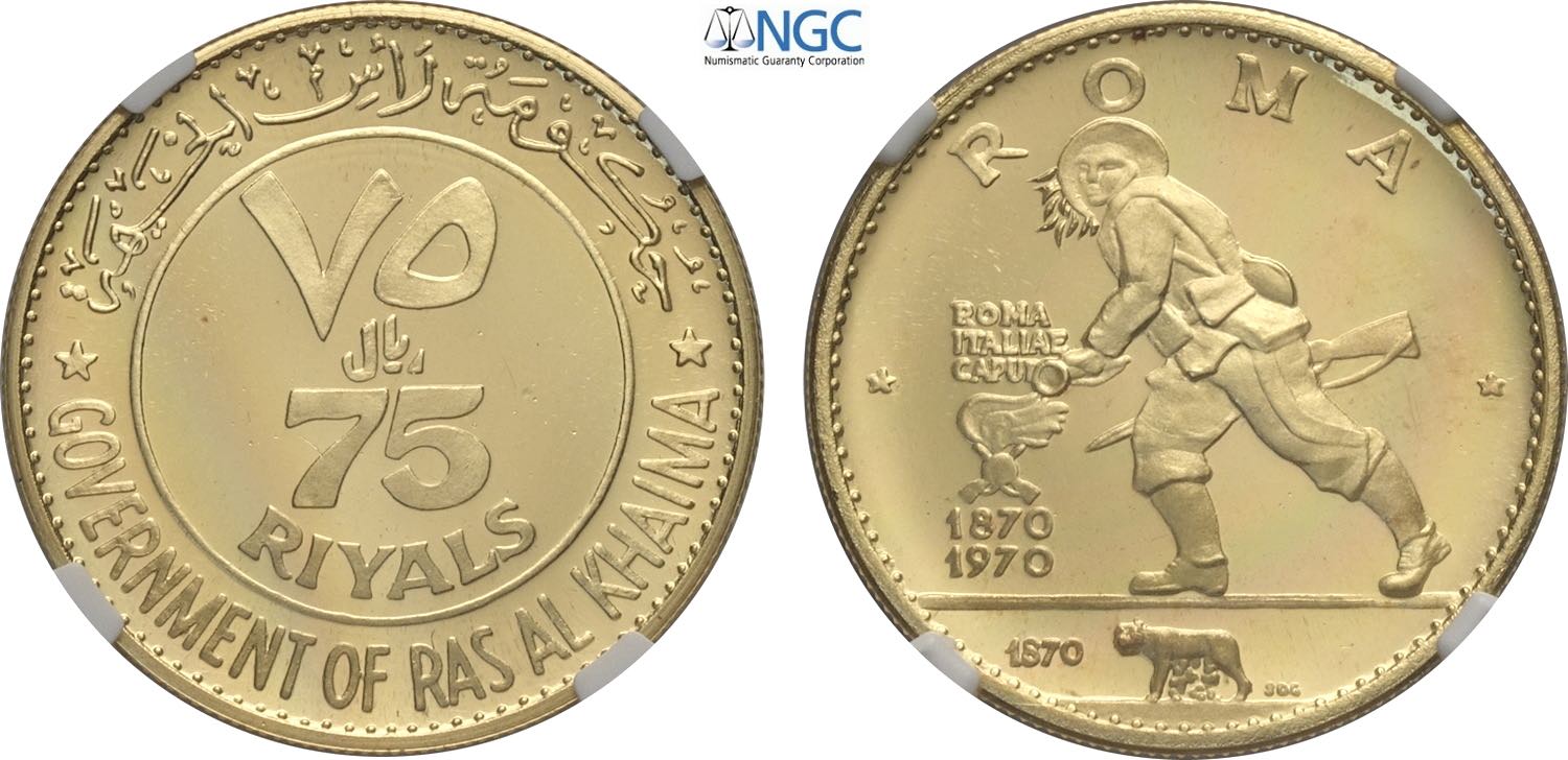 Ras Al-Khaimah, Saqr Bin Muhammad al-Qasimi (1948-), 75 Riyals 1970, KM-22 Au 28 mm 15,53 g, in Slab NGC PF68 Ultra Cameo