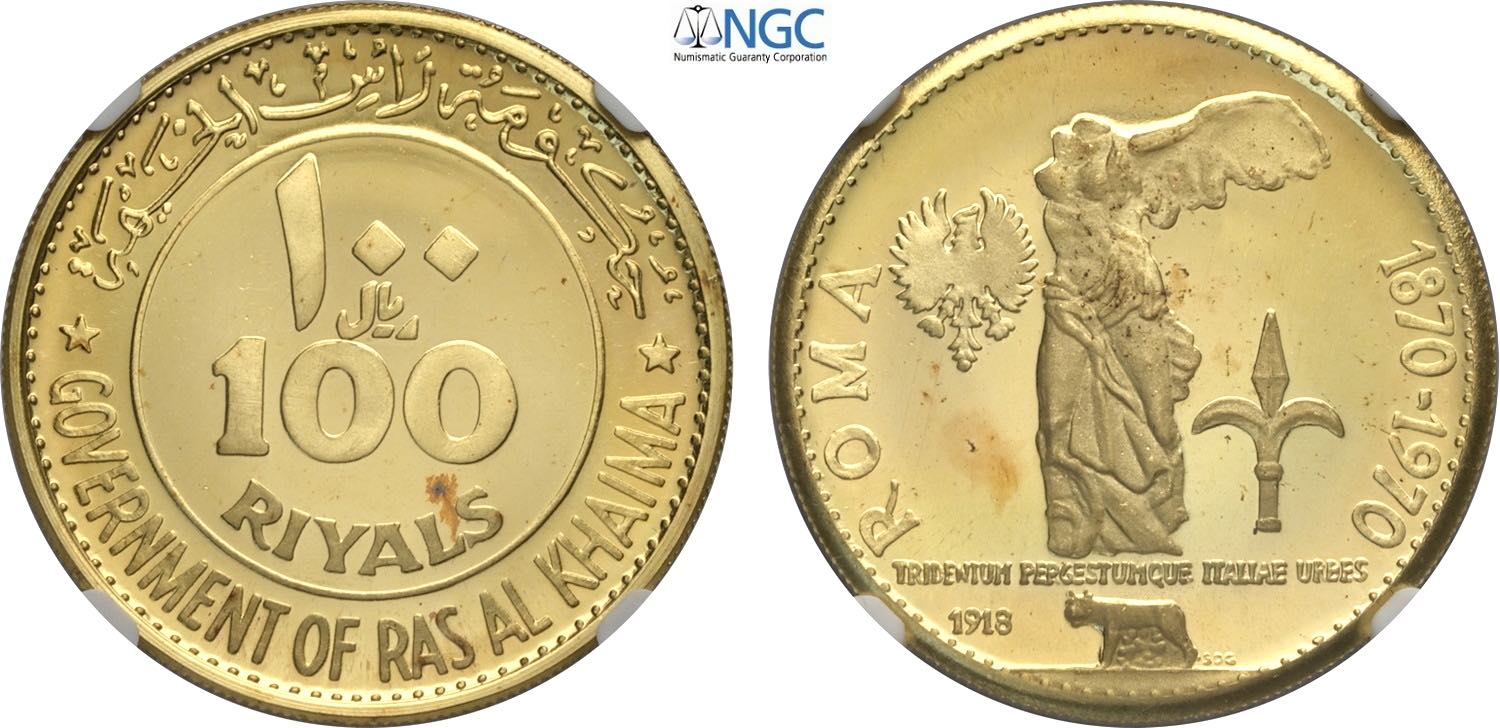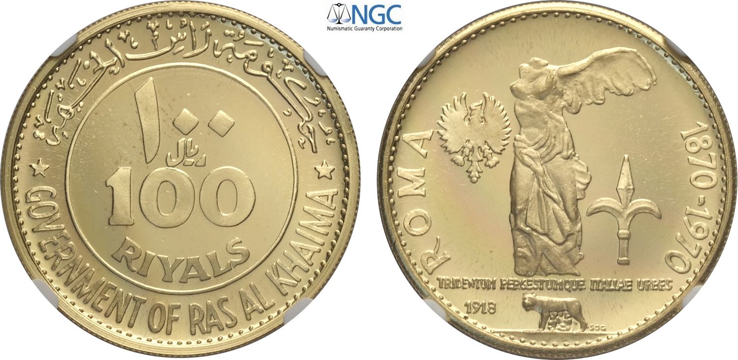 Ras Al-Khaimah, Saqr Bin Muhammad al-Qasimi (1948-), 100 Riyals 1970, KM-23 Au 31,5 mm 20,70 g, in Slab NGC PF67 Ultra Cameo