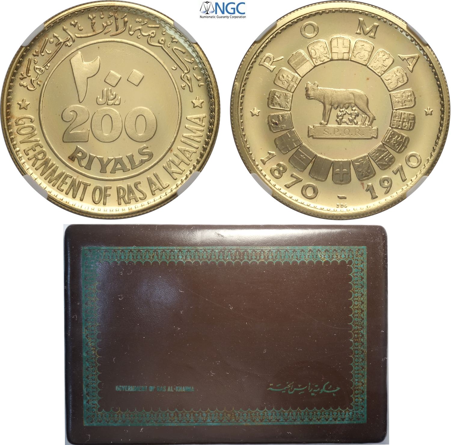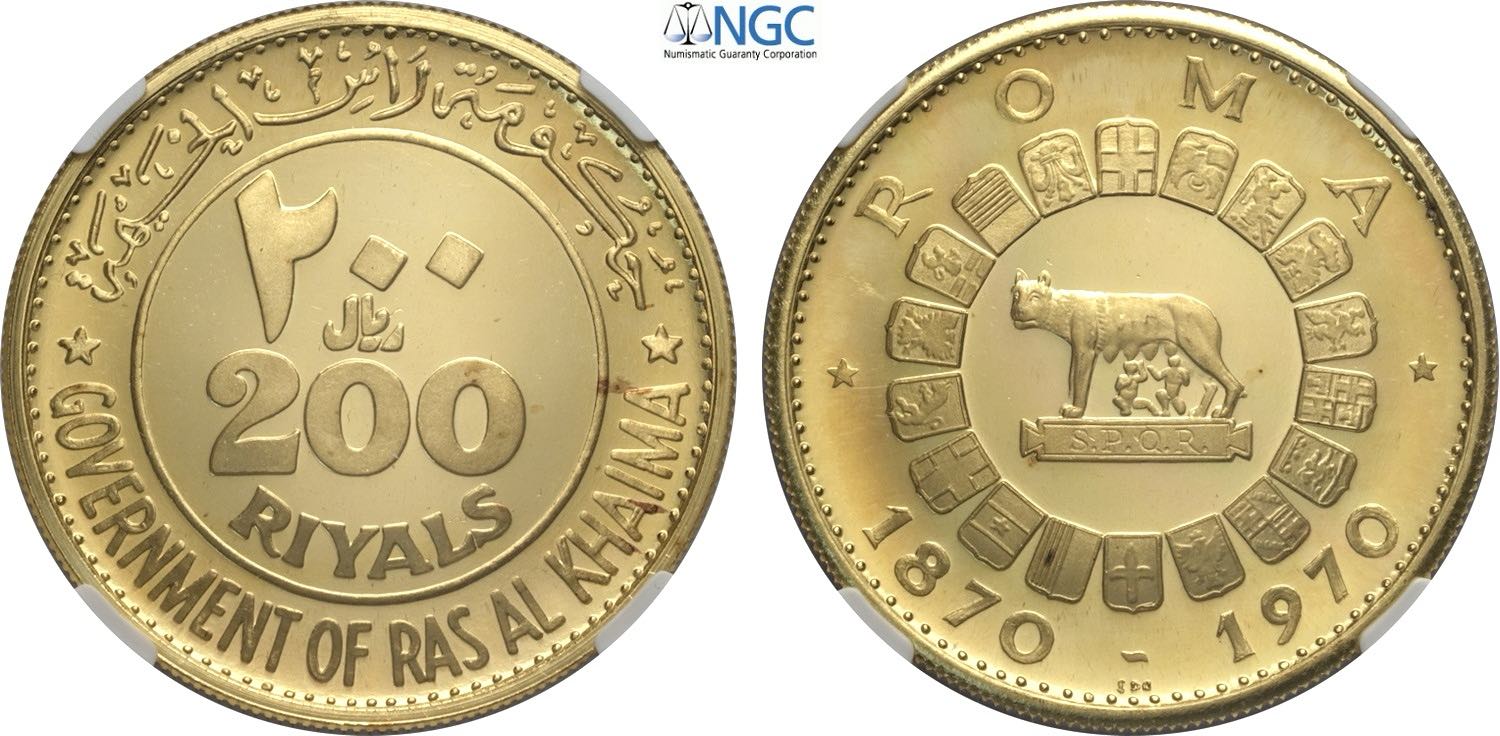 Ras Al-Khaimah, Saqr Bin Muhammad al-Qasimi (1948-), 200 Riyals 1970, KM-25 Au 41 mm 41,40 g, in Slab NGC PF67 Ultra Cameo