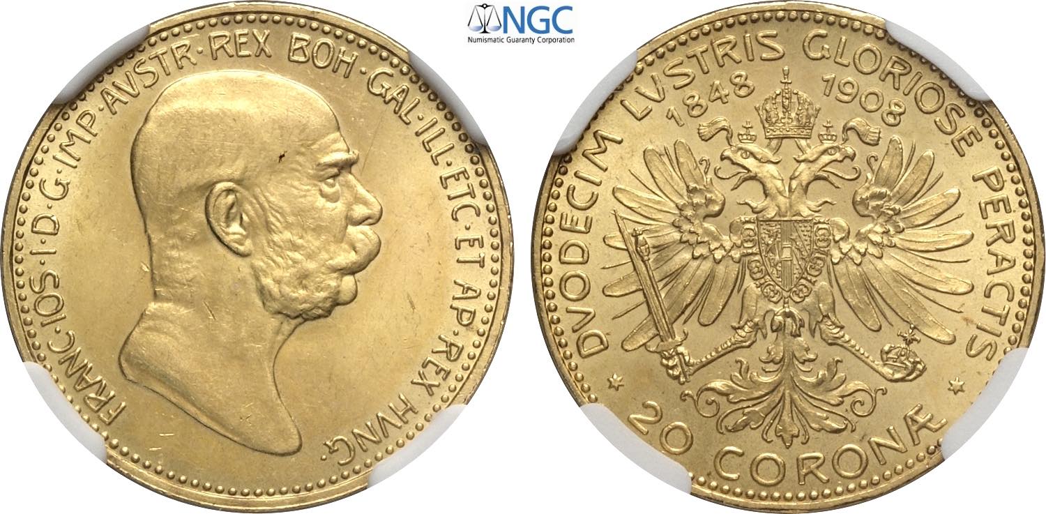 Austria, Franz Joseph I (1848-1916), 20 Corona 1908, Wien mint, Au 21 mm, 6,77 g, in Slab NGC MS64