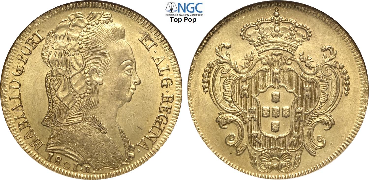 Brazil, Maria I (1786-1816), 6400 Reis 1801-R, Rio de Janeiro mint, Bent-283.15, Au 32 mm, 14,34 g, in Slab NGC MS63 Top Pop (cert. ...