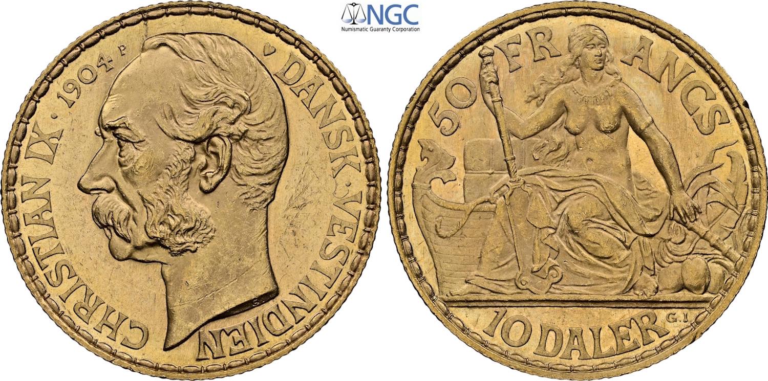 Danish West Indies, Christian IX (1863-1906), 50 Francs (10 Daler) 1904, Copenhagen mint, Au 28 mm, 16,12 g, in Slab NGC MS62