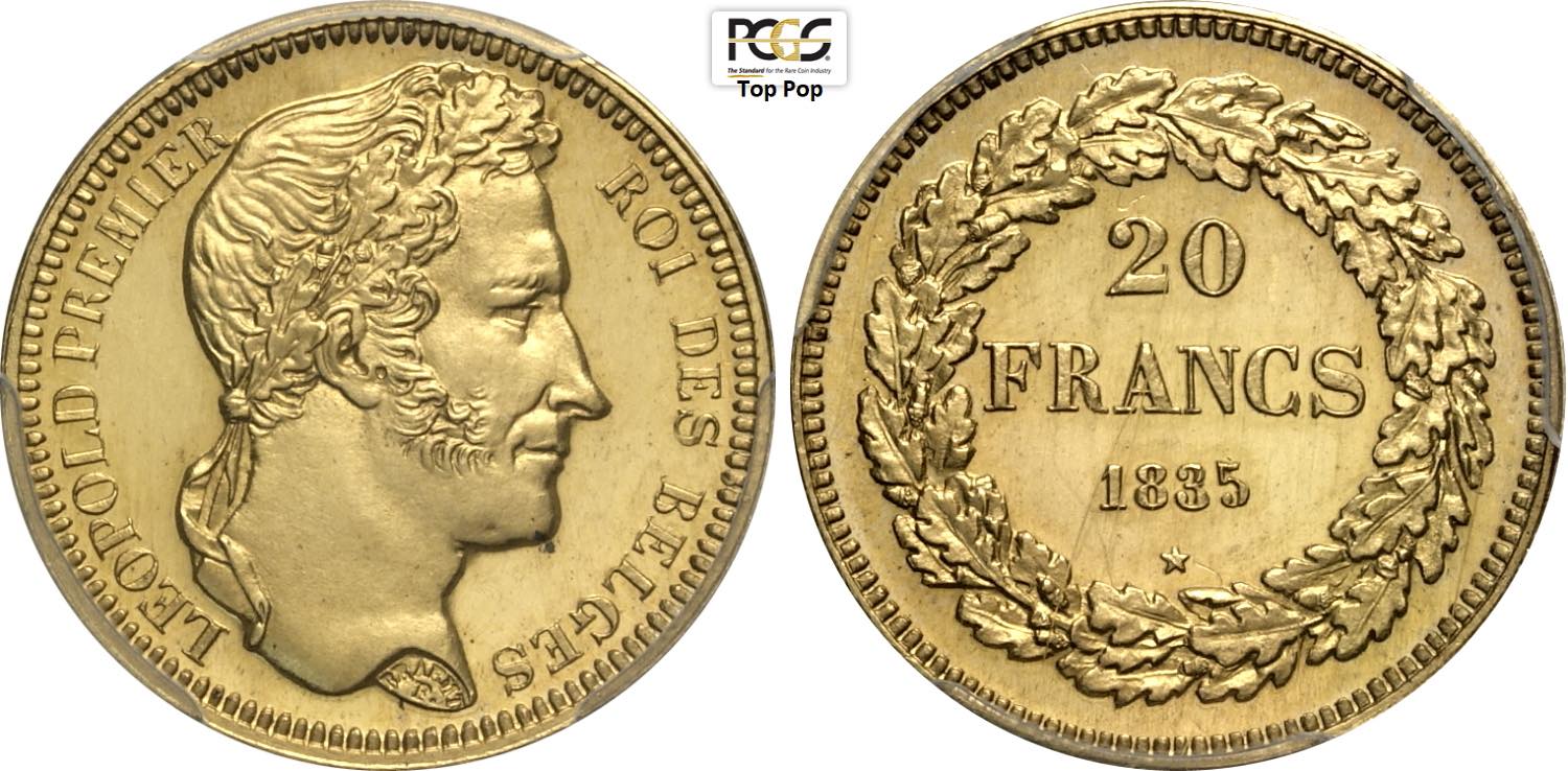 Belgium, Leopold I (1831-1865), 20 Francs 1835 Restike plain edge, Brussels mint, Dup-116 KM-23.3, Au 21 mm, 6,45 g, in Slab PCGS MS64 Top ...