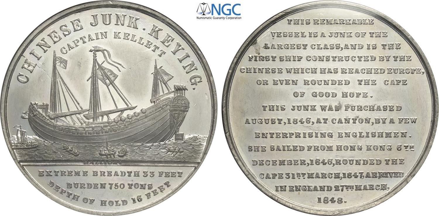 China-Great Britain, white metal medal 1848 Chinese junk keying, BHM-2320, 45 mm, ca 25 g, in Slab NGC UNC-rev spot removed