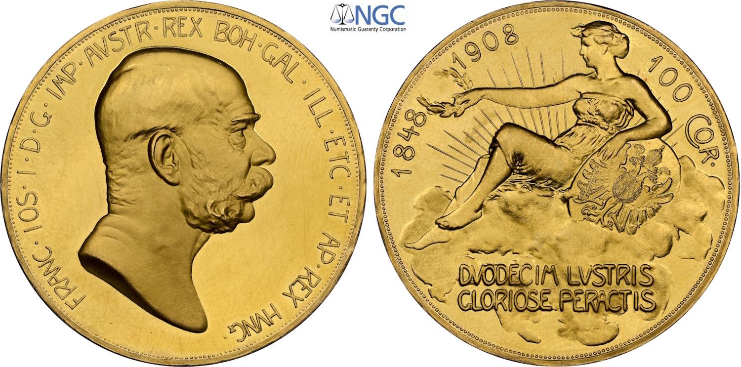 Austria, Franz Joseph I (1848-1916), Proof 100 Corona 1908, Kremnitz mint, Au 37 mm, 33,87 g, in Slab NGC PF62* (Star)