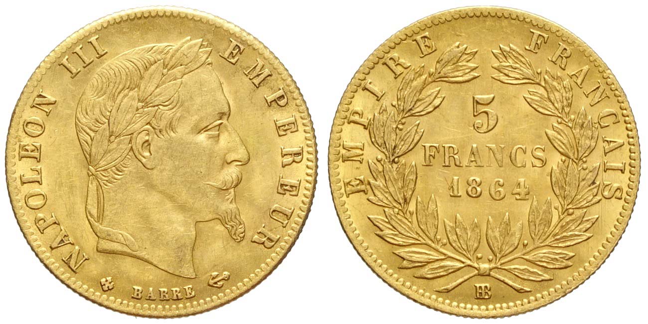 France, Napoleon III, 5 Francs 1864 BB, Au ...