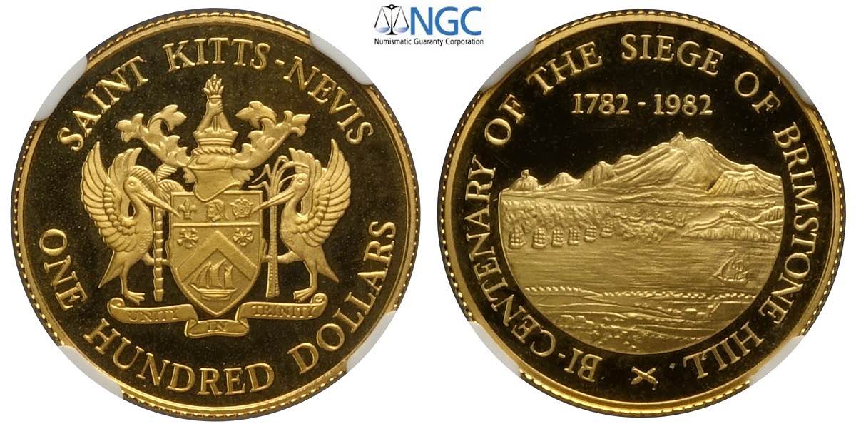 Saint Kitts & Nevis, 100 Dollars ND-1982 (pound), Au mm 22 in slab NGC PF67 Ultra Cameo