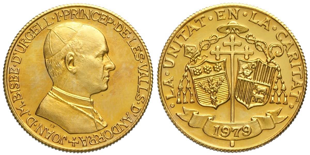 Andorra, Principality, Joan D.M. Bisbe D'Urgell I, Pattern off metal strike Sovereign 1979, Gilt Bronze mm 22 g 4,60, KM unlisted, apparently unpublished, In original envelope from the Johnson factory, author of the minting. FDC