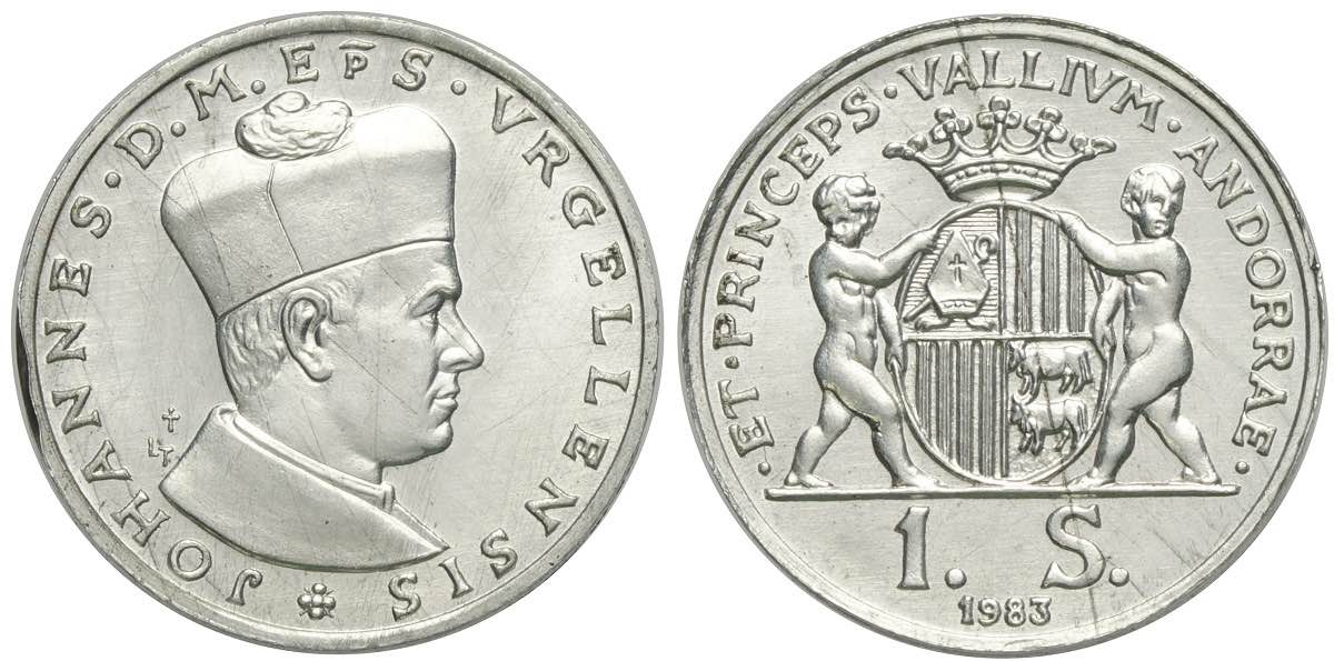 Andorra, Principality, Joan D.M. Bisbe D'Urgell I, Pattern off metal strike Sovereign 1983, Aluminum mm 22 g 1,57, KM unlisted, apparently ... Leggi tutto