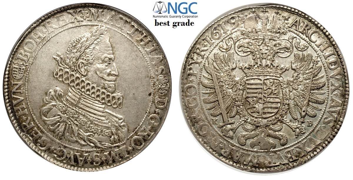 Hungary, Matthias, Thaler 1619-KB, Dav-3056 Ag mm 43 alta conservazione per questo tipo, in Slab NGC MS61 (best grade of NGC)