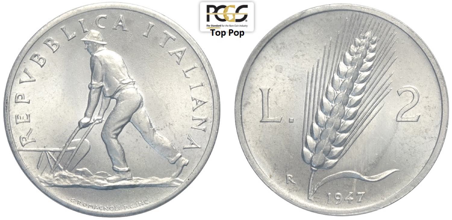 Repubblica Italiana, monetazione in Lire (1946-2001), 2 Lire 1947, RRR Al mm 24,1 FDC in Slab PCGS MS66 (Top Pop! cert. 33569350)