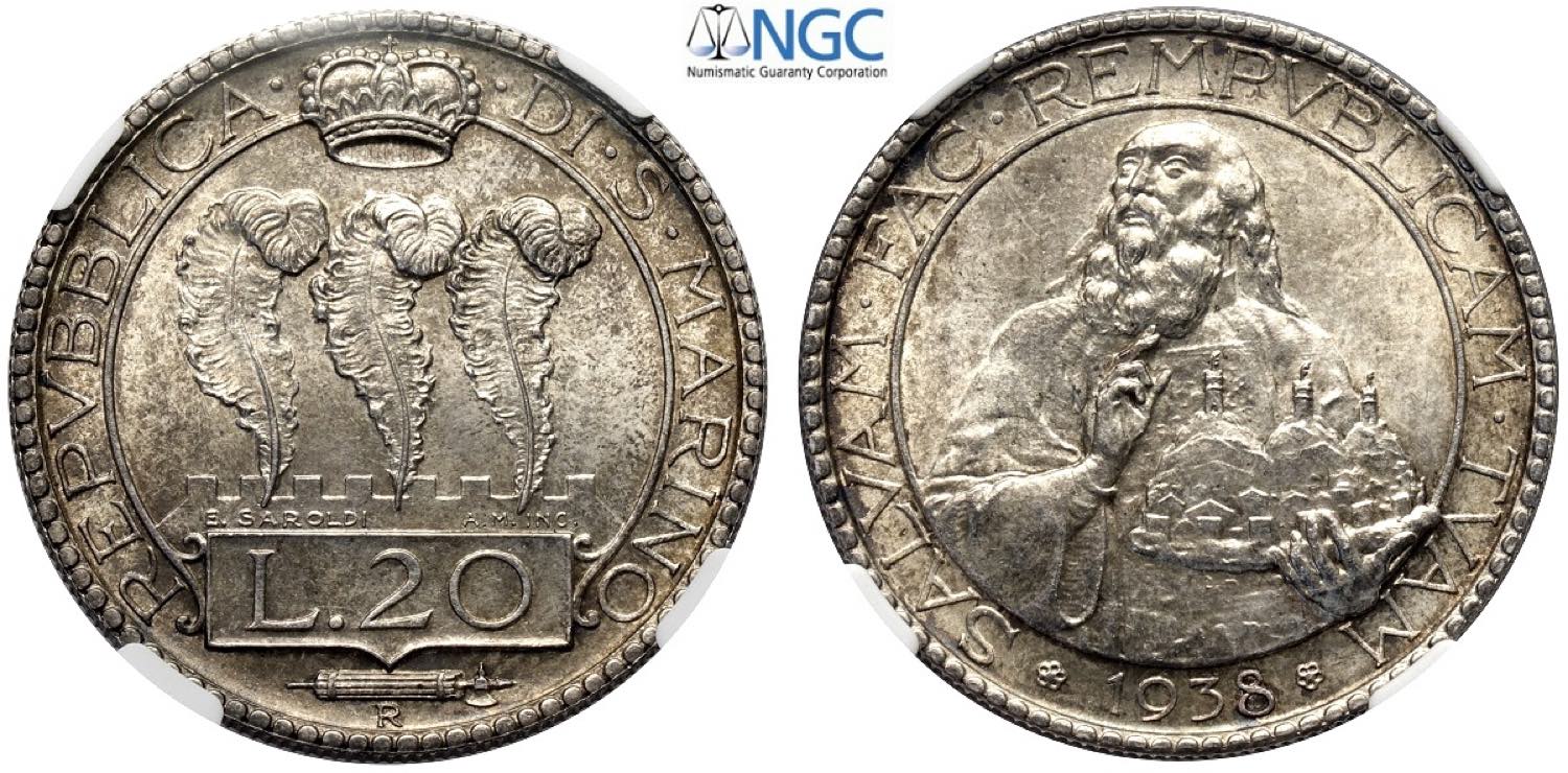 San Marino, Vecchia Monetazione (1864-1938), 20 Lire 1938, RR Ag mm 35,5 FDC in slab NGC MS64 (cert. 6633893008)