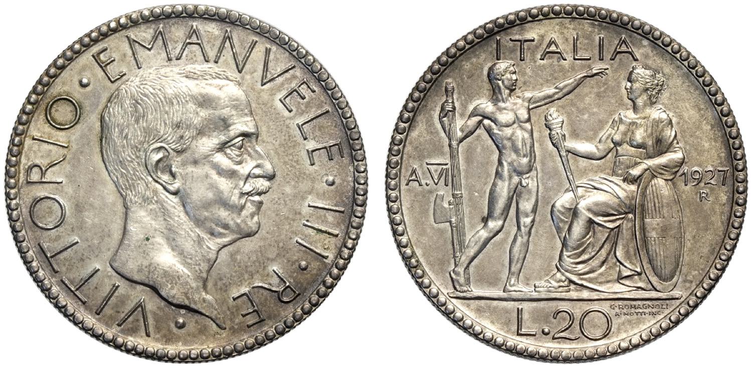 Regno d'Italia, Vittorio Emanuele III (1900-1943), 20 Lire 1927 anno VI, Ag mm 35,5 SPL