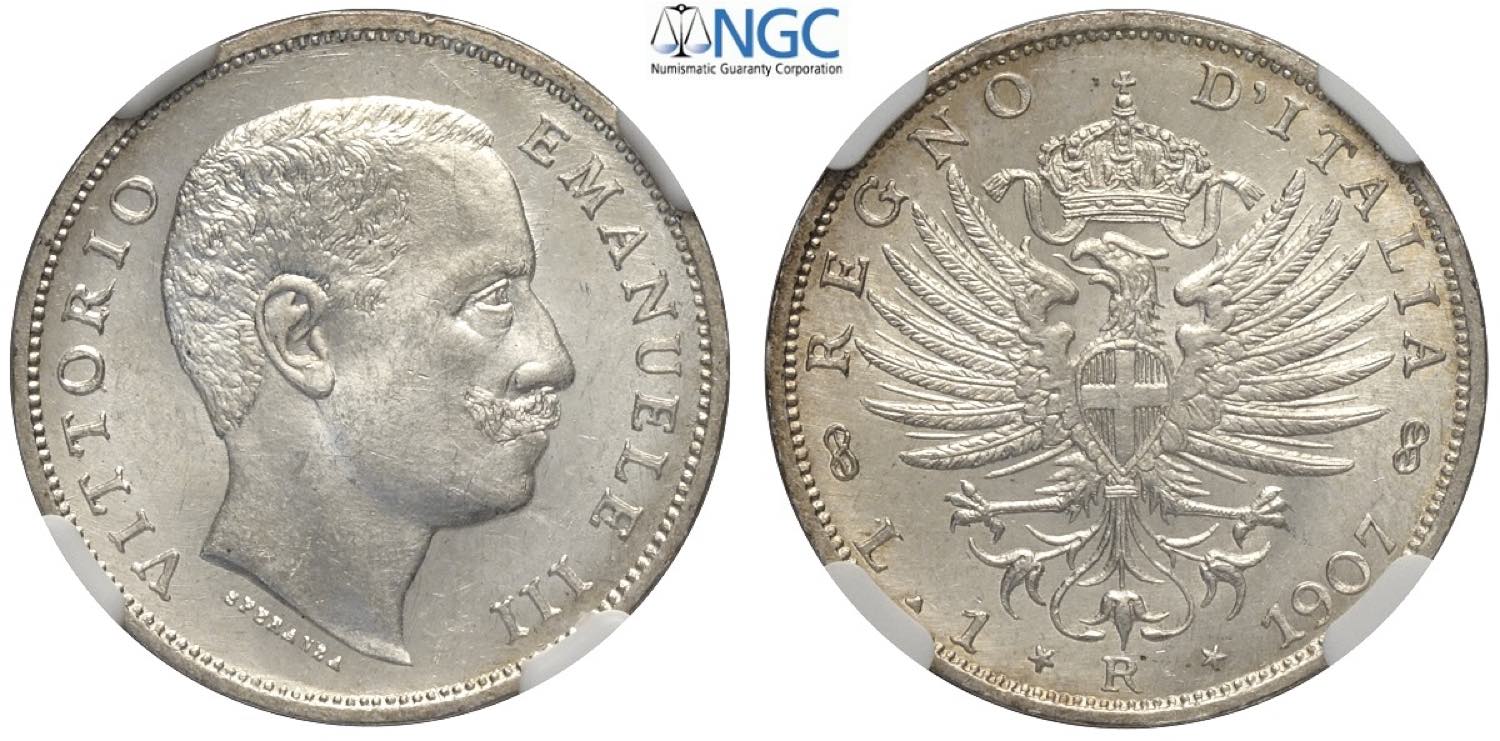 Regno d'Italia, Vittorio Emanuele III (1900-1943), Lira 1907, Ag mm 23 in Slab NGC MS64 (cert. 6141760012)