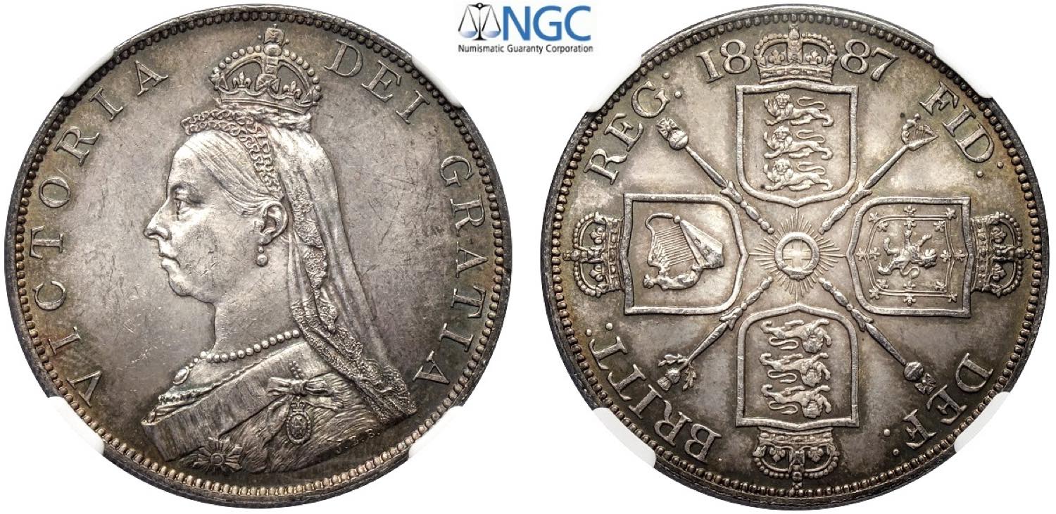 Great Britain, Victoria (1837-1901), Double Florin 1887 Roman 1 variety, Ag mm 36 g 22,62 di gran conservazione e patina, In slab NGC MS64