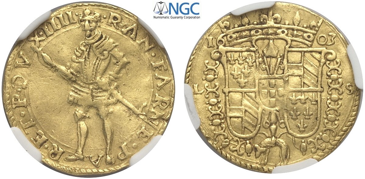 Parma, Ranuccio I Farnese (1592-1622), Ongaro 1603, Rara MIR-981 Au mm 21 g 3,45 in Slab NGC AU-from jewelry (lievi tracce di montatura)