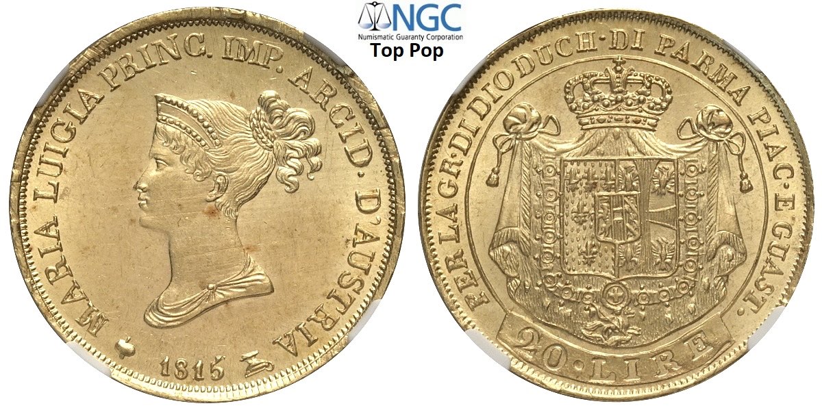 Parma, Maria Luigia d'Austria (1815-1847), 20 Lire 1815, Rara Au mm 21 conservazione eccezionale, in Slab NGC MS64 (cert. 6632192006 Top Pop!)